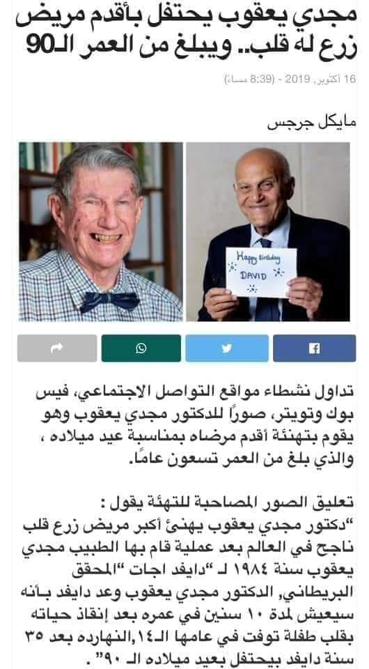 وديفيد اجات هو اكبر مريض عمرا اجري له الدكتور مجدي يعقوب عملية زراعة قلب سنة 1984 وفي الصوره يهنئه الدكتور مجدي يعقوب بعيد ميلاده التسعون